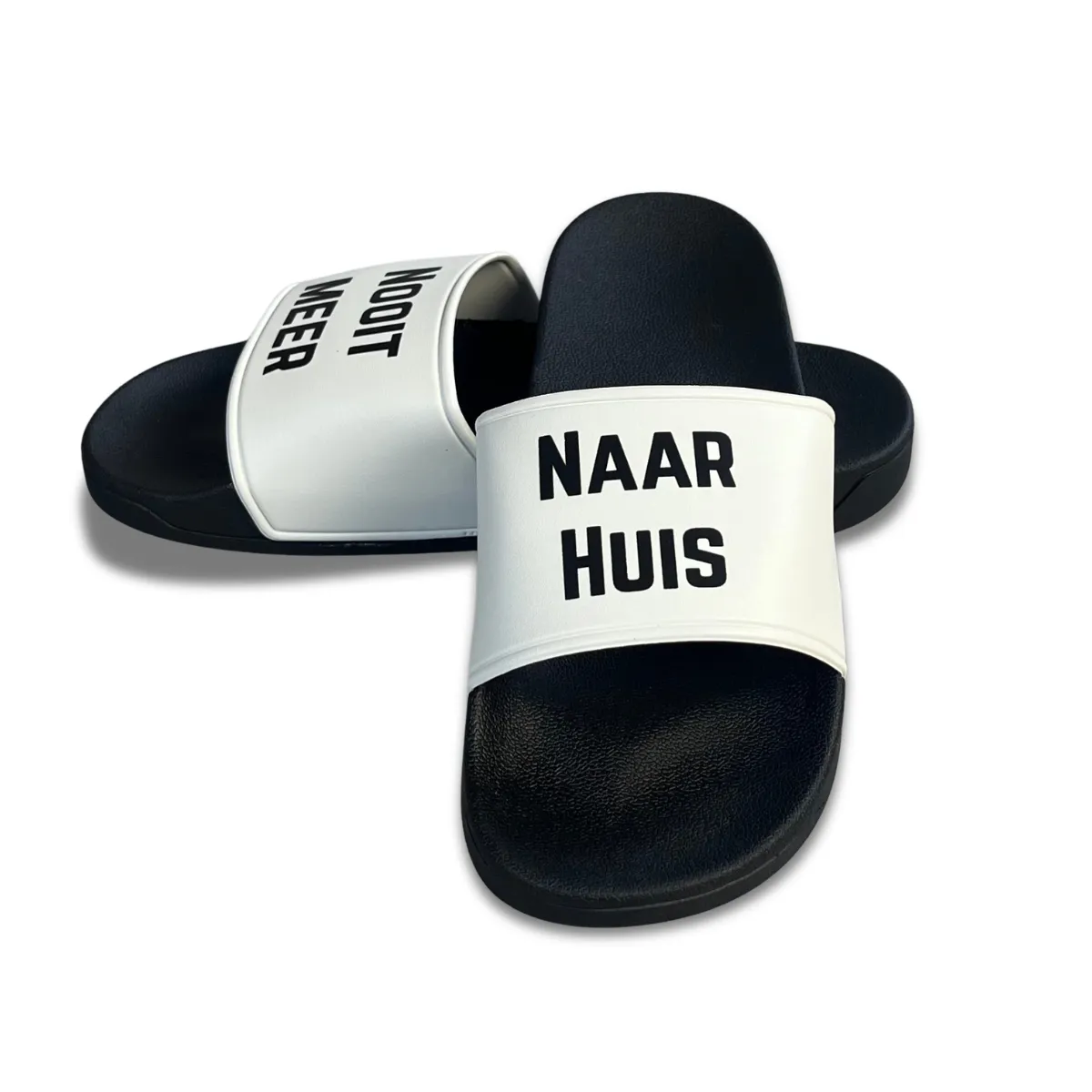 Opvallend design: Op de slippers staat in grote, zwarte letters het statement “Nooit Meer” en “Naar Huis”. Een perfecte knipoog naar elke doorhaler of nachtbraker!